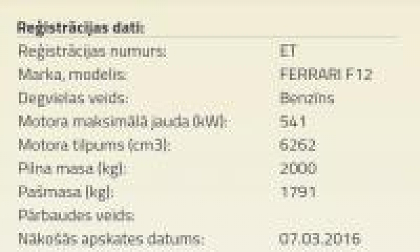 В Латвии зарегистрирован новый Ferrari F12 Berlinetta с госномером ET — итальянское купе, стоимость базовой модели которого составляет 275 тыс. евро. Собственником машины является внештатный советник мэра Риги Эрик Тейланс.